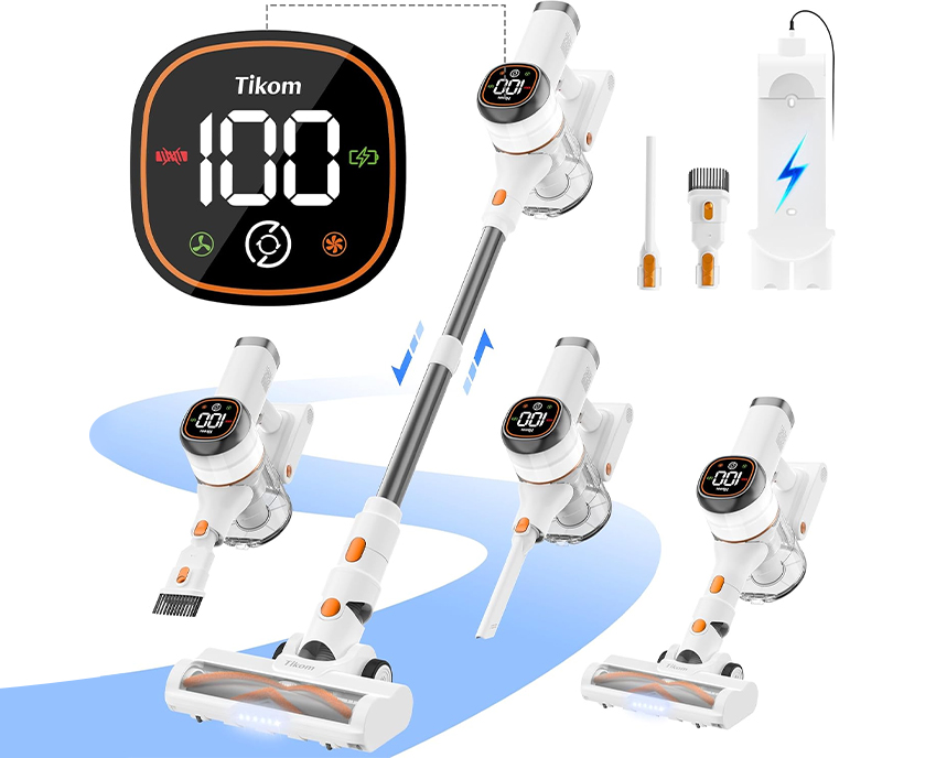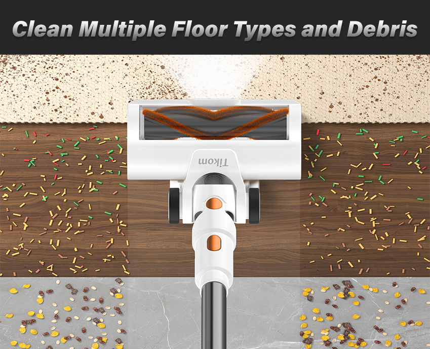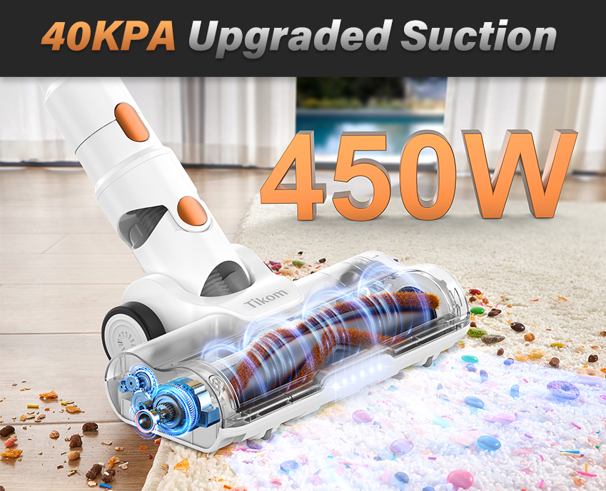 【450W/40Kpa Powerful Suction】Tikom V500 Cordless Stick Vacuum Cleaner is equipped with a high-performance 450W motor, delivering up to 40Kpa suction power. The stick vacuum effortlessly handles pet hair, dog food crumbs, cat litter, and other debris, making it ideal for homes with pets