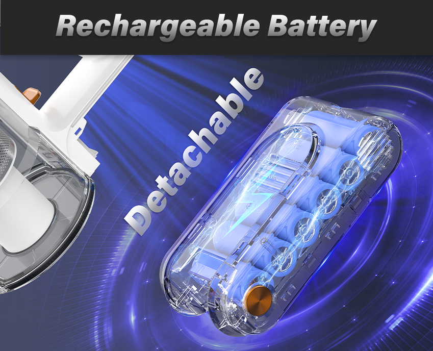 【Wall-Mounted Charging Dock】 Equipped with a 6*2000 mAh removable battery and a wall charge station, the rechargeable vacuum offers 2 charging methods. Detach the battery to charge separately, or keep the vacuum cleaner on the wall dock for automatic charge and storage.