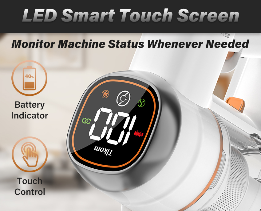 【LED Smart Touch Screen】 The household vacuum cleaner comes equipped with a Color Display to monitor working status, suction level, remaining battery and warnings of malfunctions. And the suction level can be switched with just one touch. Complete control at your fingertips.