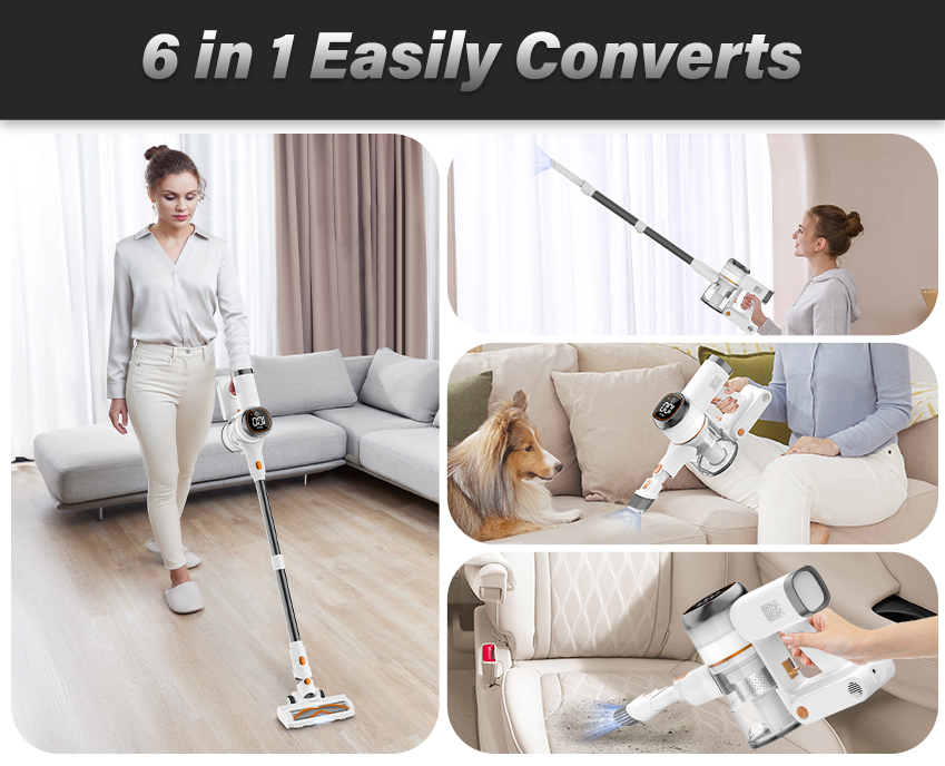 【6 in 1 Effortless Versatility】 Easily Converts this portable vacuum cleaner from a stick vacuum, to a hand vacuum, to a stair vacuum and back again, which can help you clean car seat, pet beds, stairs, kitchen crevices, college dorm, carpet, hardwood floor, sofa. Meet your multi-purpose cleaning.