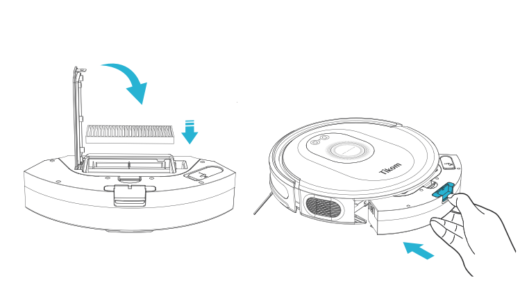 8. Setzen Sie den HEPA-Filter wieder in das Filterfach ein und platzieren Sie den Staubbehälter zur眉ck im Roboter.