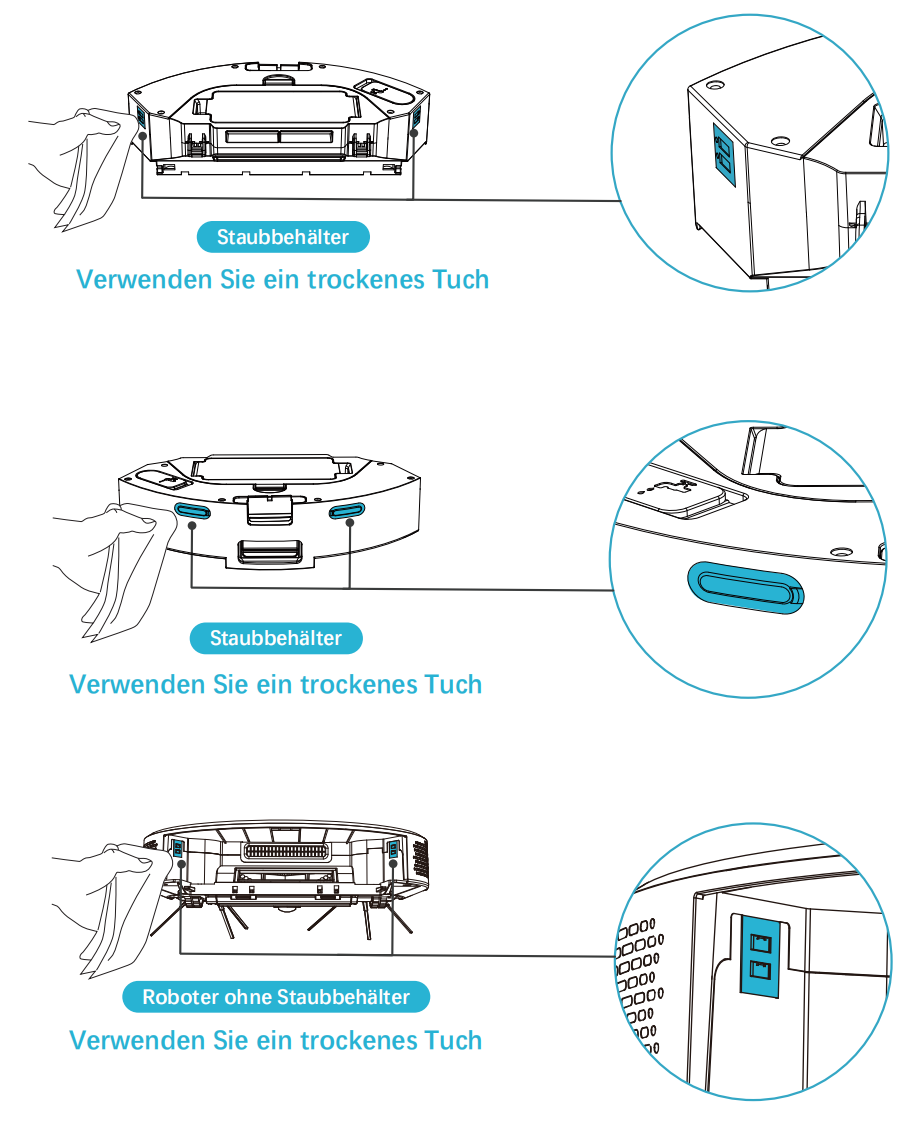1. Verwenden Sie ein feuchtes Tuch, um alle Sensoren (mit Blau markiert) am Roboter und an der Selbstentleerungsstation zu reinigen.