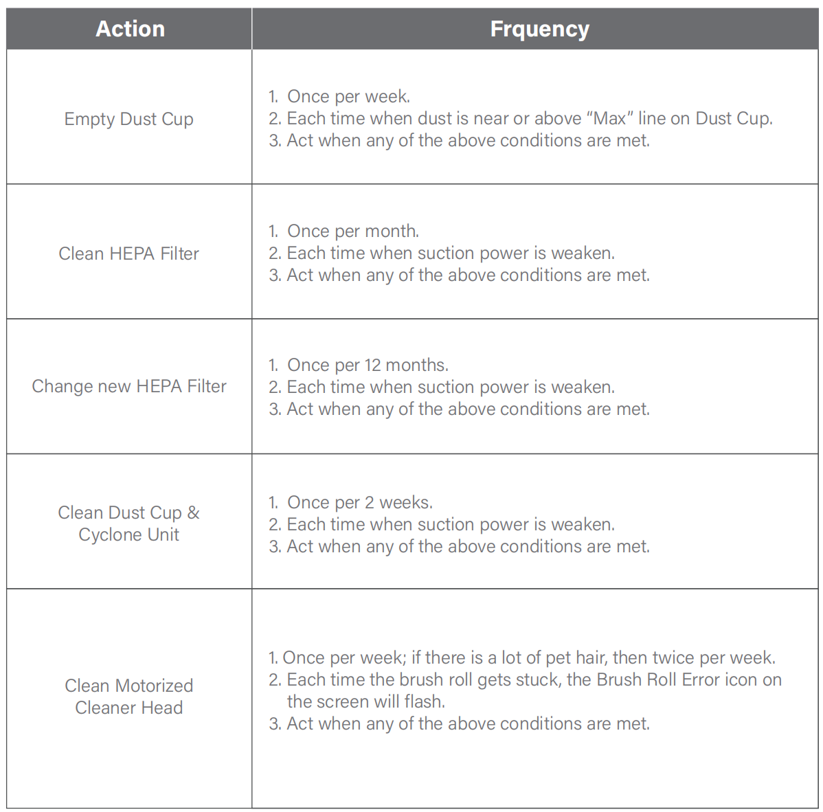 Cleaning & Replacement Frequency [V850]