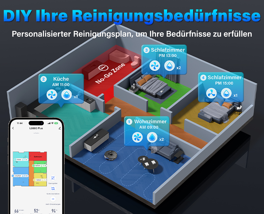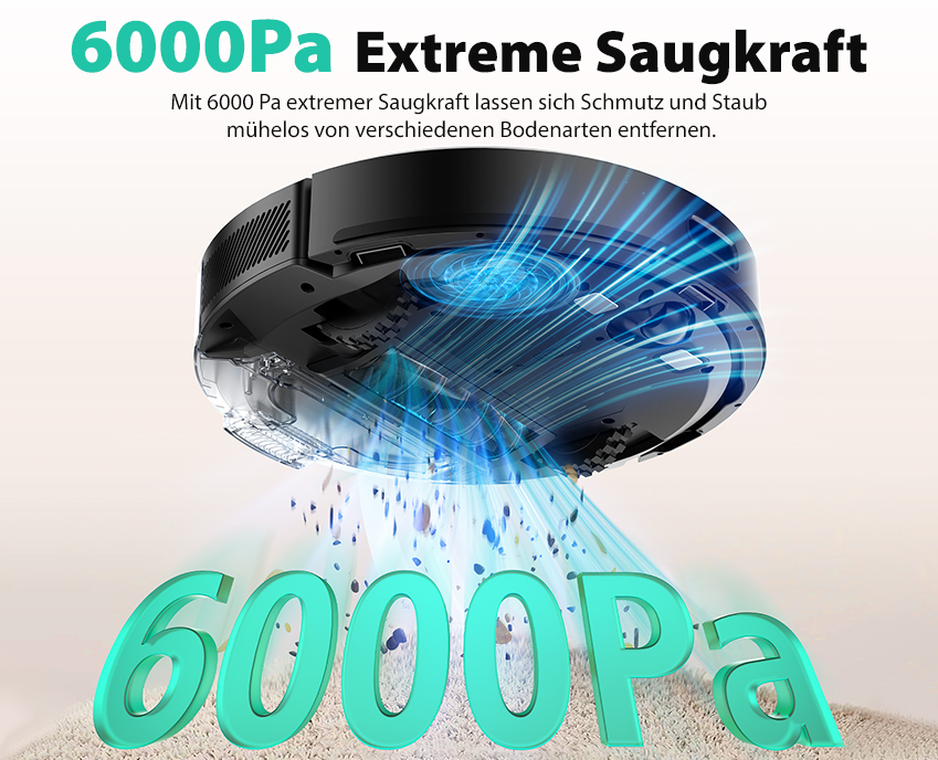 銆6000 Pa starke Saugkraft銆 Der Saug und Wischroboter L8000 Plus ist mit einer Wischfunktion ausgestattet, um Schmutz, Tierhaare, Staub und mehr effektiv von Bodenflächen zu entfernen. Auf Teppichen erhöht sich die Saugleistung automatisch auf 6000 Pa (maximal) f眉r eine gr眉ndlichere Reinigung, geeignet f眉r Hartböden, Fliesen, Holzböden und kurzflorige Teppiche.