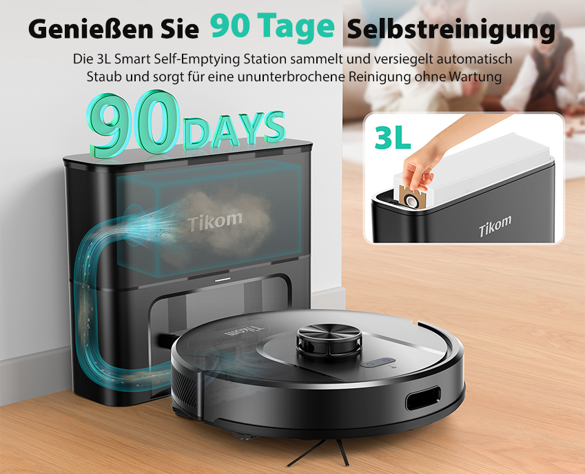 銆90 Tage freihändiges Reinigen銆Die automatische Entleerungsfunktion des Saugroboters L8000 Plus bietet ein unvergleichliches Komforterlebnis. Er wird mit einem 3-Liter-Staubbeutel geliefert, der bis zu 90 Tage lang ununterbrochen reinigen kann, ohne dass der Staubbehälter manuell ausgetauscht werden muss.
