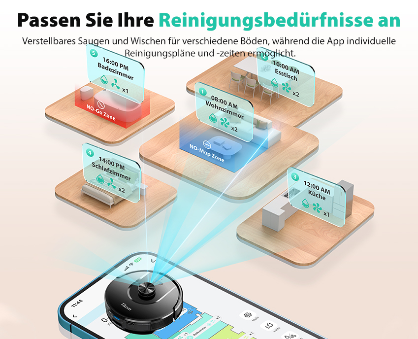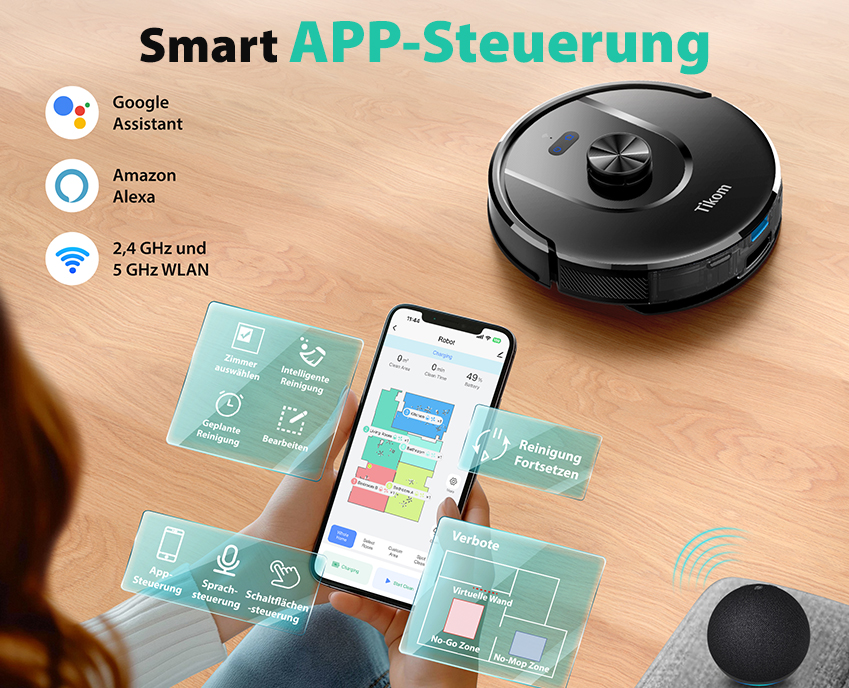銆怋equeme App & Sprachsteuerung銆 Mit dem Roboterstaubsauger können Sie No-Go-Zonen und No-Mop-Zonen einrichten, virtuelle Wände festlegen, Reinigungszeiten planen, bestimmte Räume oder Bereiche auswählen sowie Wassermenge und Saugleistung nach Bedarf anpassen. Der Roboterstaubsauger ist zudem Alexa-kompatibel und unterst眉tzt 2,4-GHz- sowie 5-GHz-WLAN. So wird die Smart-Home-Reinigung zum Kinderspiel.