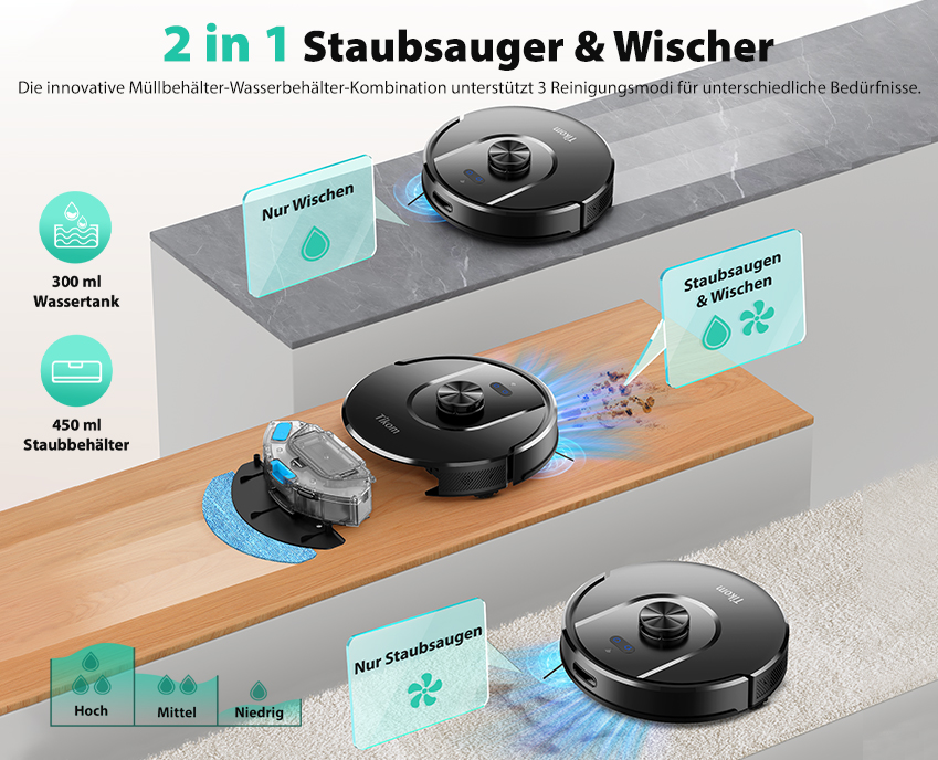 銆2-in-1 Fegen und Wischen銆 Dieser Saugroboter mit Wischfunktion unterst眉tzt mehrere Reinigungsmodi: nur Fegen, nur Wischen oder Fegen und Wischen gleichzeitig. Er nutzt die neueste Wischtechnologie und ein dreistufiges Entwässerungssystem, um Schmutz m眉helos von Ihren Böden zu entfernen (Staubbehälter: 450 ml, Wassertank: 300 ml).