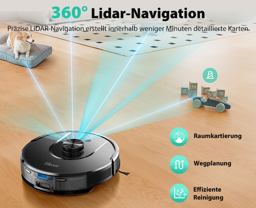 銆怭räzise LiDAR-Navigation銆 Dieser staubsauger roboter ist mit fortschrittlicher LiDAR-Technologie ausgestattet, um 360掳 zu scannen und bis zu f眉nf Karten Ihres Zuhauses f眉r eine nahtlose Reinigung zu erstellen. Er vermeidet Hindernisse wie Wände und Treppen intelligent und stellt sicher, dass keine Bereiche ausgelassen oder doppelt bearbeitet werden.