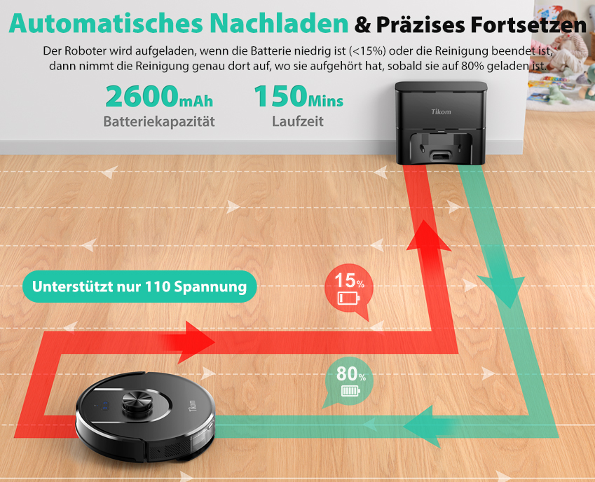 銆150 Min. Laufzeit & Auto-Aufladung銆 Genießen Sie bis zu 150 Minuten ununterbrochene Reinigung im sanften Saugmodus. Wenn der Akku schwach wird, lädt sich der Saugroboter mit Wischfunktion automatisch wieder auf und setzt das Wischen und Saugen dort fort, wo er aufgehört hat 鈥 so haben Sie die Hände frei und genießen ein komfortables Erlebnis.
