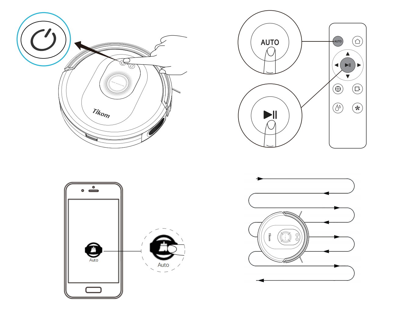 5. Dr眉cken Sie die Ein/Aus-Taste am Roboter, die Auto-Taste auf der Fernbedienung oder „Auto鈥 in der App, um mit dem Wischen zu beginnen.