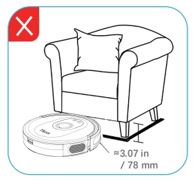 A. Vermeiden Sie L眉cken, die nahe bei 78 mm (3,07 Zoll) liegen (die Dicke des Roboterkörpers), um zu verhindern, dass der Roboter stecken bleibt, wie zum Beispiel bei Sofas oder Schränken.