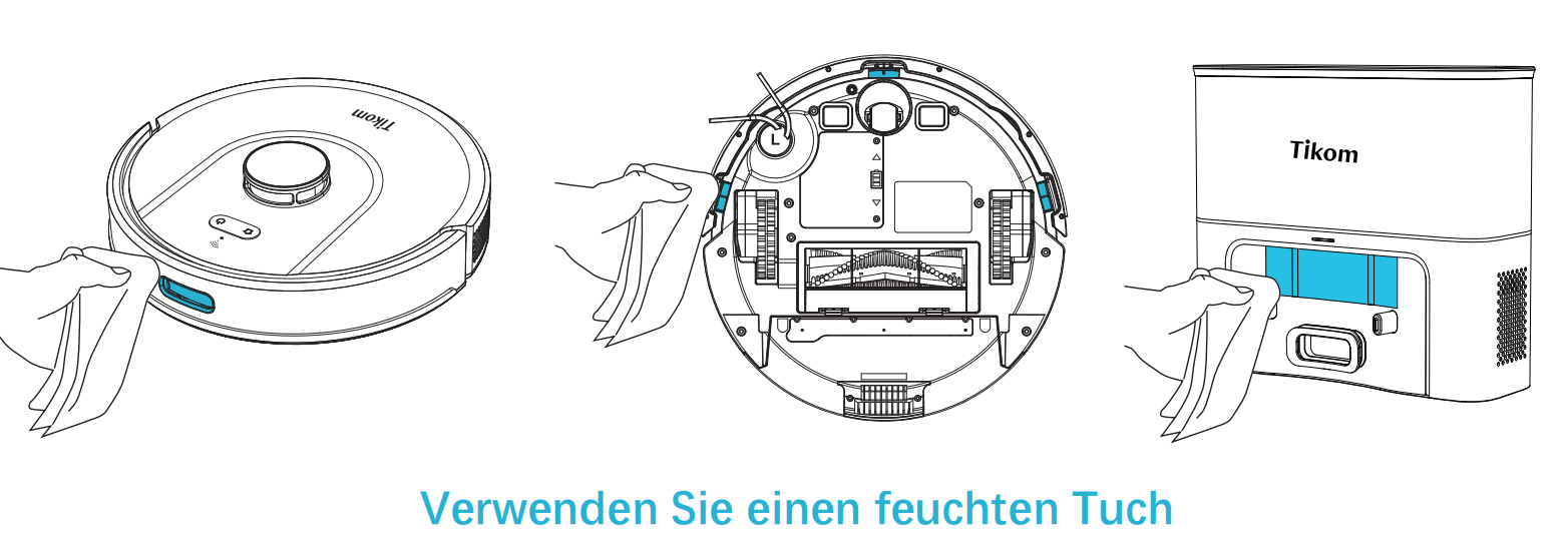 1. Verwenden Sie ein feuchtes Tuch, um alle Sensoren (mit Blau markiert) am Roboter und an der Selbstentleerungsstation zu reinigen.