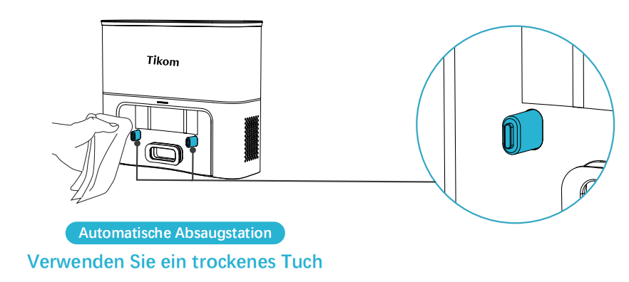 2. Verwenden Sie ein trockenes Tuch, um die 8 Lade-Kontakte (mit Blau markiert) am Roboter, Staubbehälter und an der Selbstentleerungsstation zu reinigen.