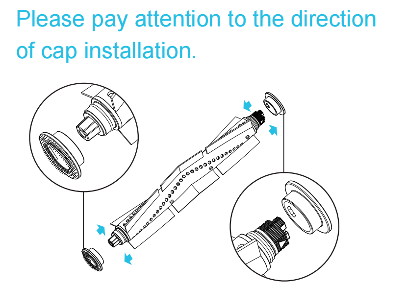 3. Open the two caps on the sides ofthe main brush, remove and clean any hair or dirt present on both sides. Reinstall the two caps on the main brush.