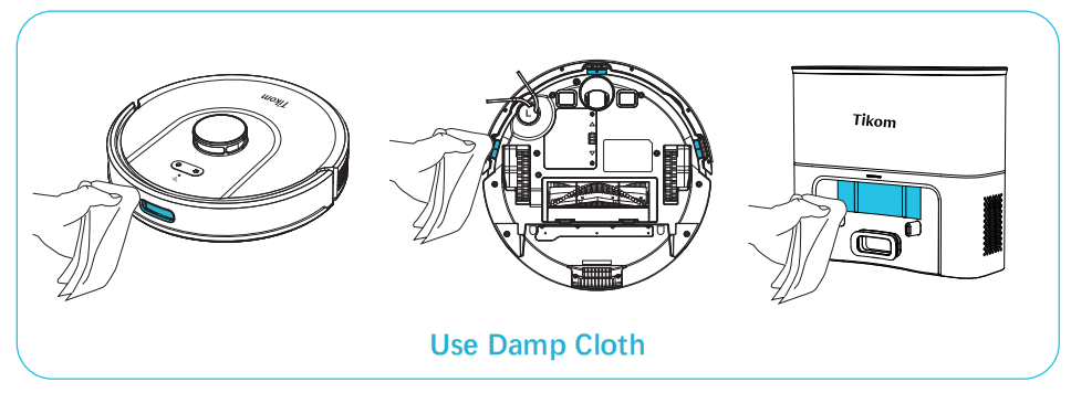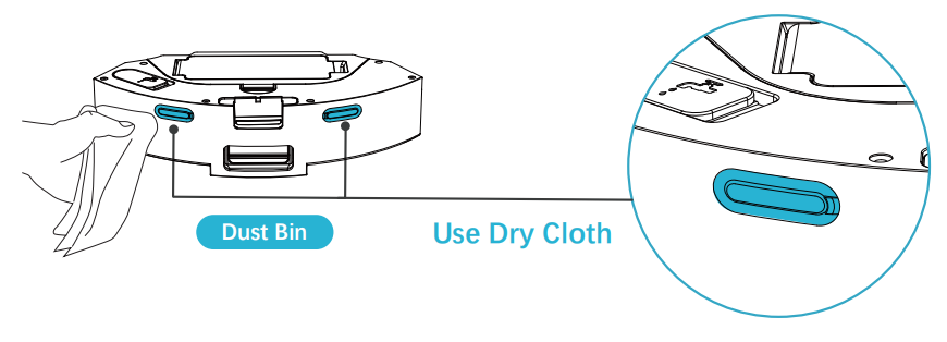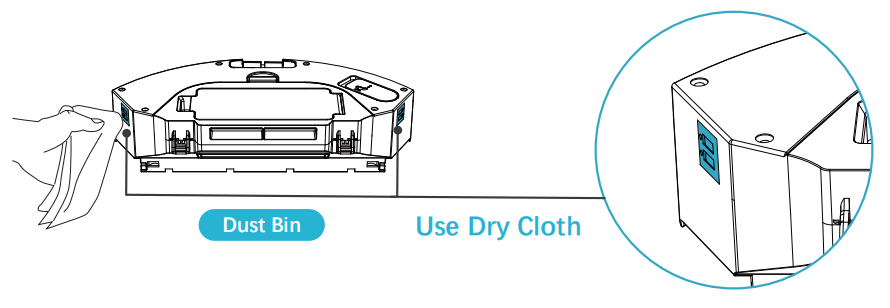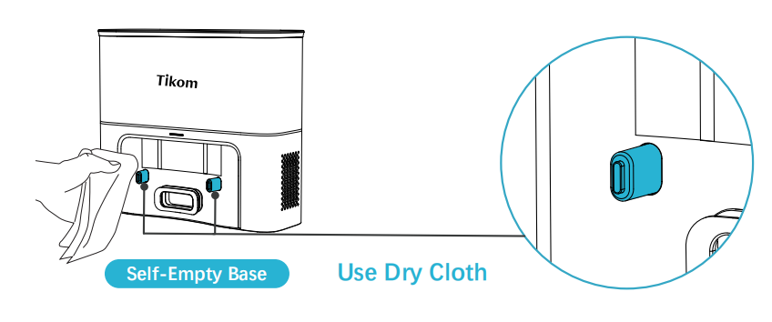 1. Use a damp cloth to clean all sensors (marked as blue) on the robot and the Self-Empty Base.