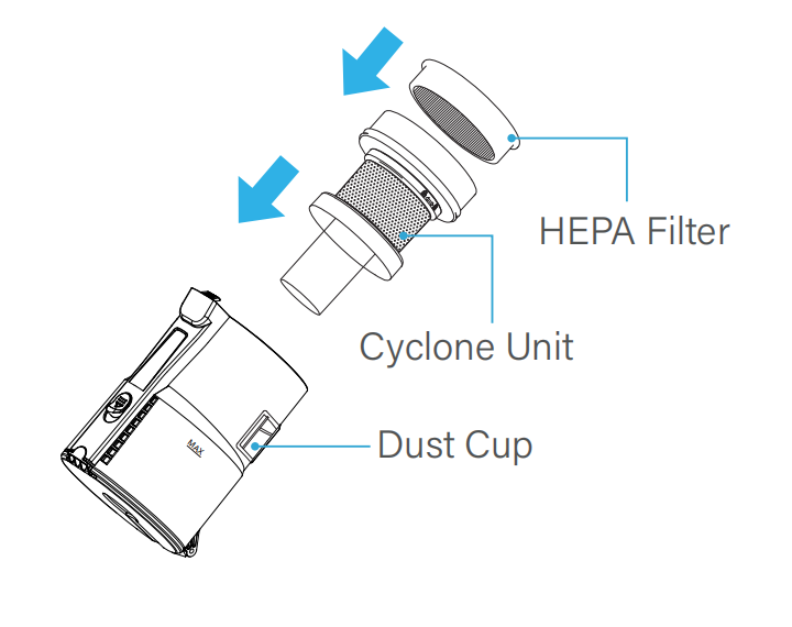 2. Take off the Cyclone Unit and HEPAFilter from the Dust Cup.